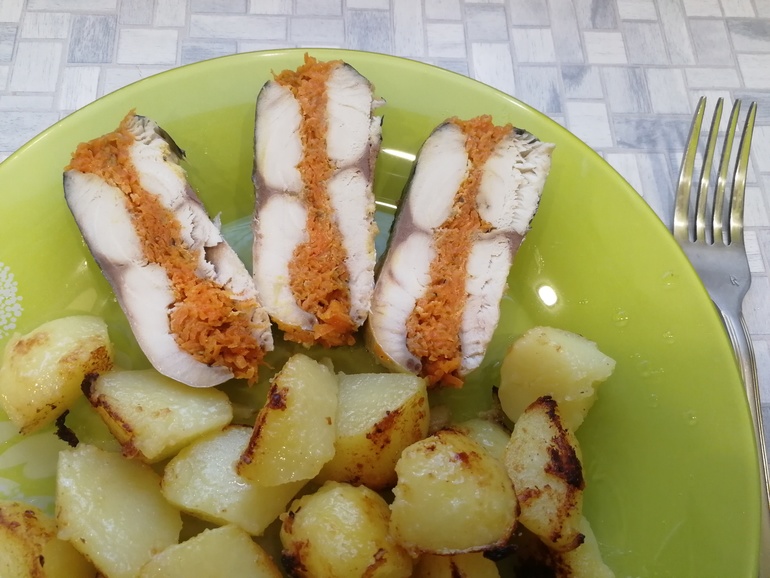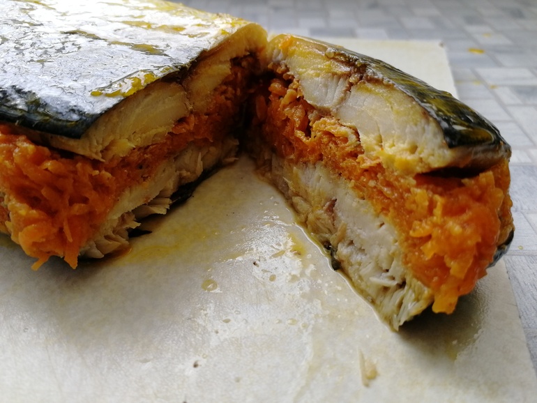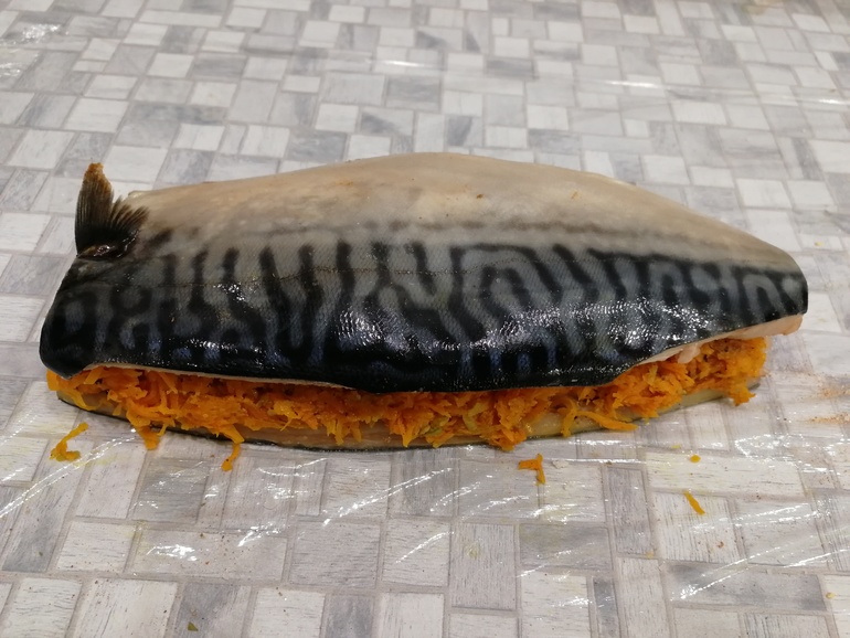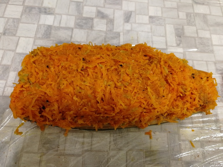 Немного пожалела моркови, учту. И по мне, лучше нарезать в пленке, без нее рыба кроошится