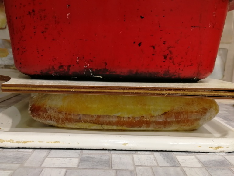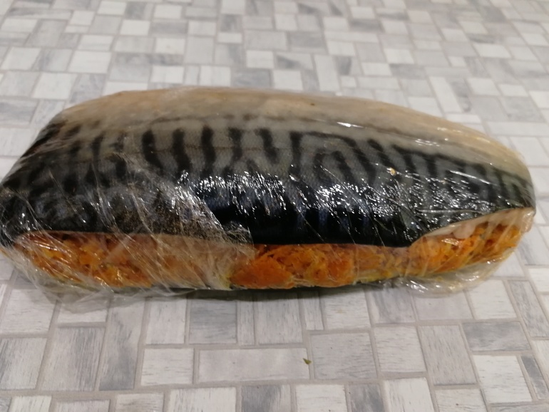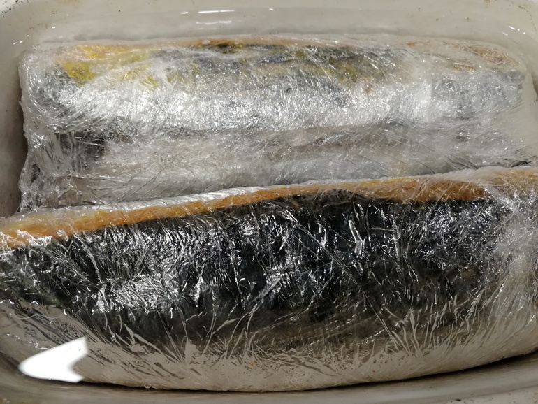 Выложить рыбу в пленке на поднос, закрыть доской и поставить сверху груз на несколько часов (я оставляла на ночь):