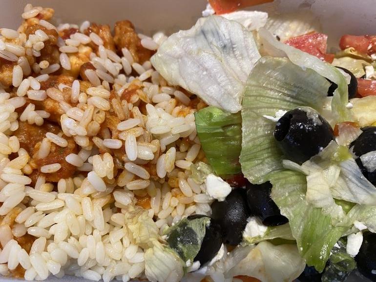- вторник - кусочки курицы в томатном соусе, рис и греческий салат