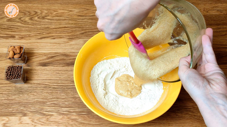 В муку добавляем кукурузный крахмал, соль, соду. Соединяем 2 смеси и замешиваем тесто