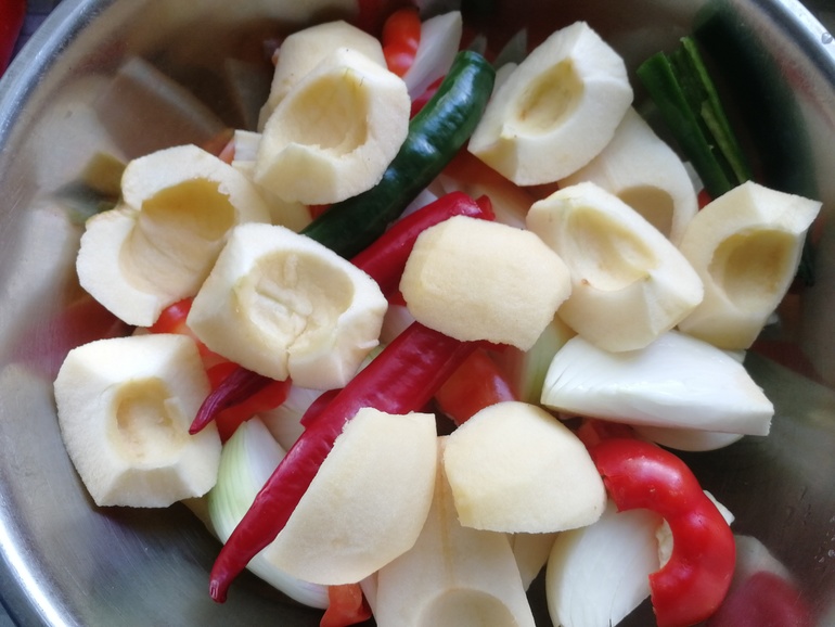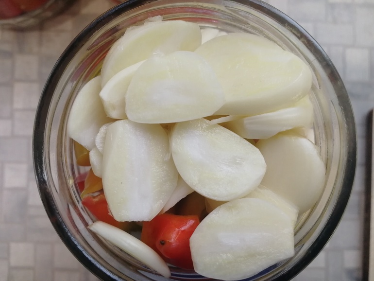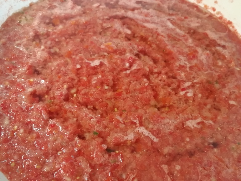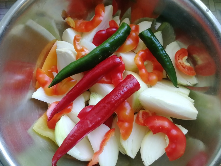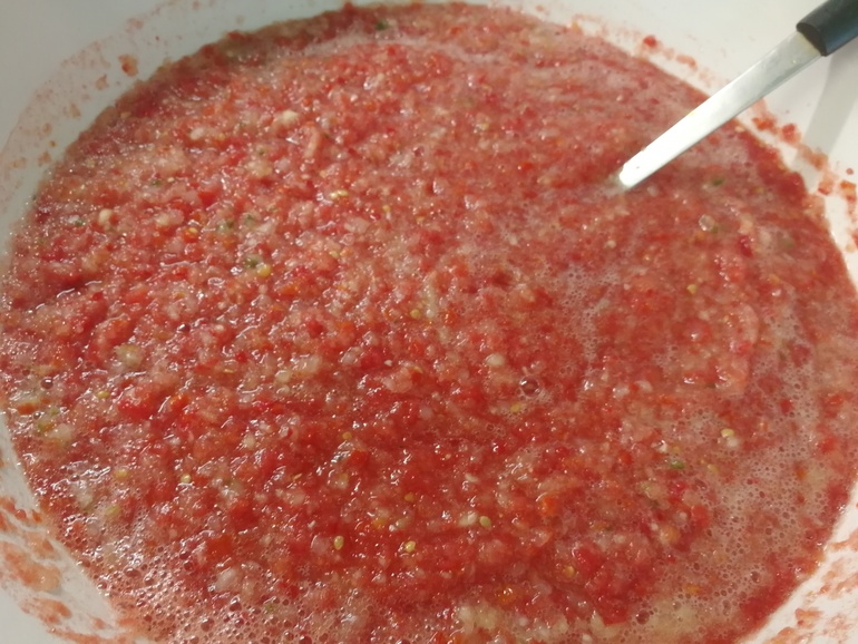 4 жгучих перчика без семян (я добавила еще остатки от болгарских перчиков):