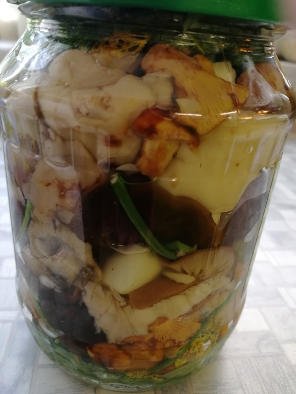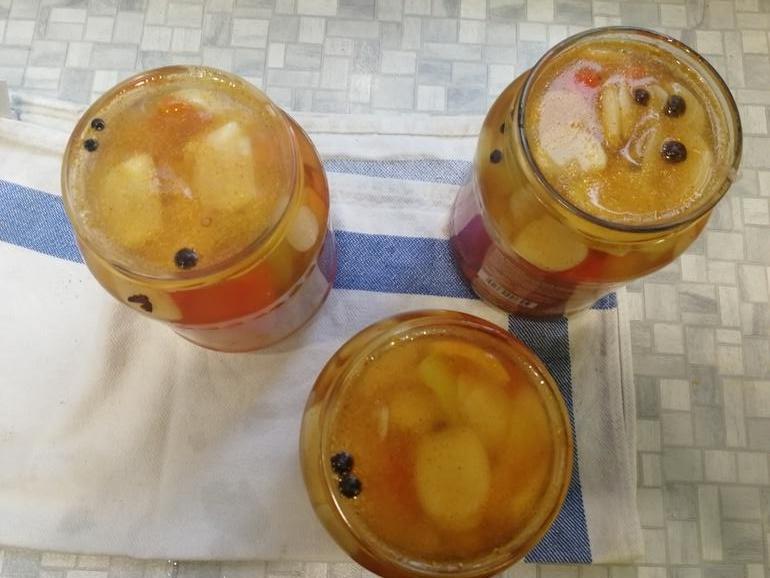 Рассол: 2 литра воды, 4 ст.л. соли, 12 ст.л. сахара, 2 ч.л. хмели-сунели, 25 горошин черного перца, 12 лавровых листиков. Закипятить.. 400 г 9% уксуса (добавить только после закипания).