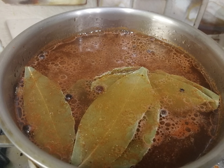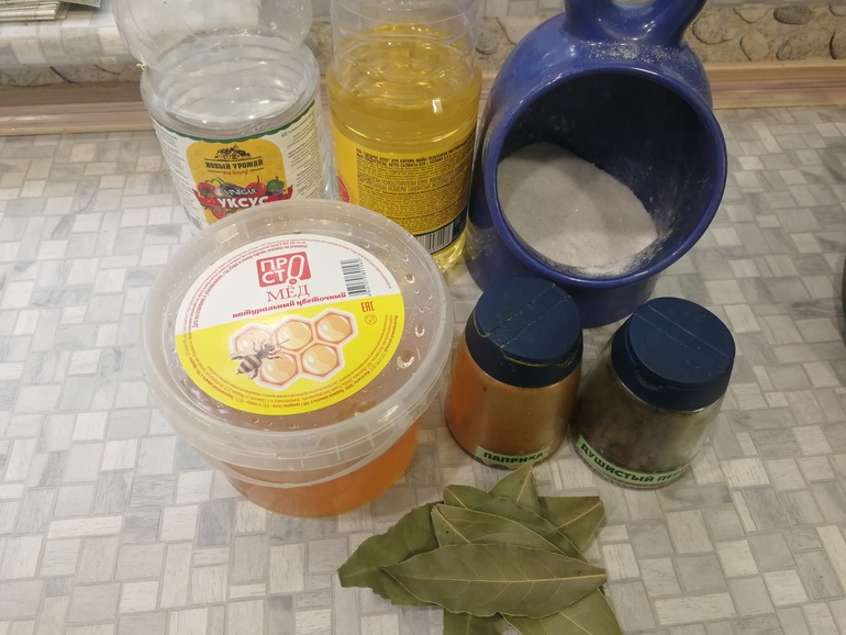 На 1 литр вода добавляем 5 ст.л. мёда, 2 ч.л. соли, 1 ч.л. паприки,, 6 шт душистого перца, 10 шт черного перца, 5 лавровых листов, 1 ст.л. растительного масла без запаха. После закипания добавляем 4 ст.л. 9% уксуса и сразу выключаем: