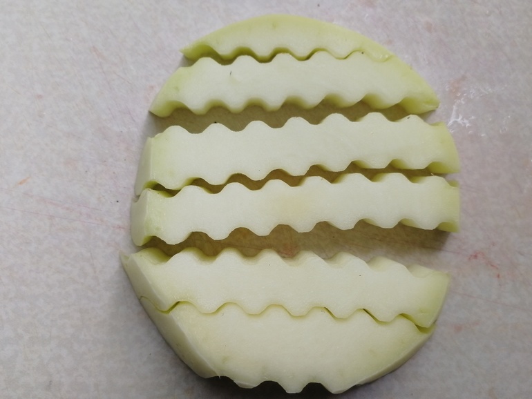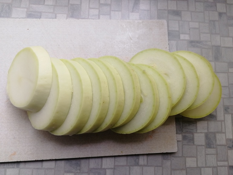 Пока закипает, нарезать кабачки. Сначала на кружки: