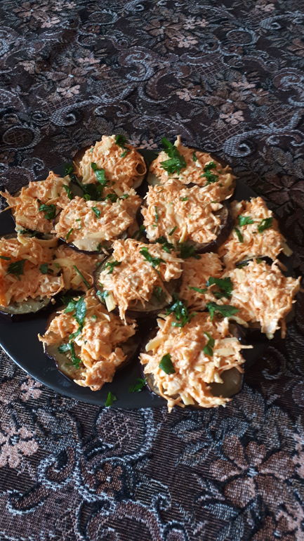 Очень вкусный и быстрый рецепт. Баклажаны нарезать кружочками, замочить в воде на 20 минут. Воду слить, баклажаны обжарить и выложить на бумажное полотенце. Натереть морковь на мелкой терке, выдавить 2-3 дольки чеснока, туда же трем сыр на крупной терке и добавляем мелко нарезанную курицу (я делала копченую грудку). Перемешиваем с майонезом и выкладываем на баклажаны. Приятного аппетита!