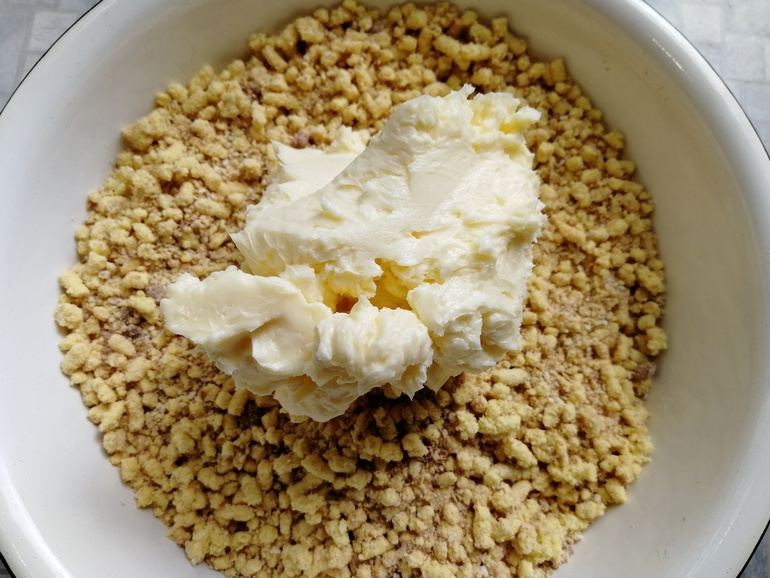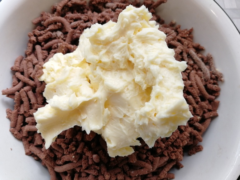 Половину крема выложить на шоколадную крошку: