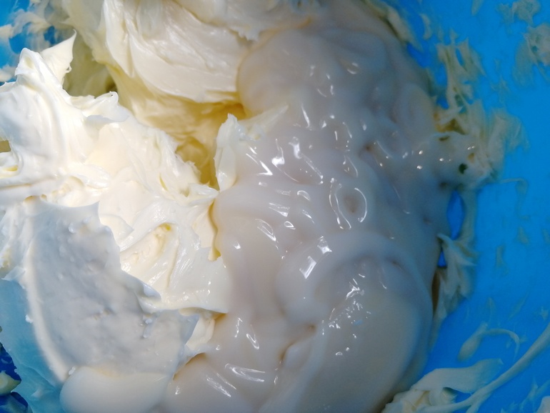 Взбить и добавить 0,5 ст. сгущенки: