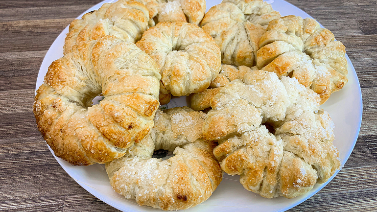 Готовые пирожки уложить на противень, смазать желтком и обильно посыпать сахаром.
