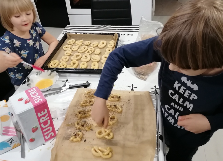 Тесто раскатать на присыпанной мукой рабочей поверхности в пласт толщиной 0,5 мм. Нарезать на полоски примерно шириной 1 см и длиной 18-12 см. Скатать их в жгутики и сформировать из них крендельки.