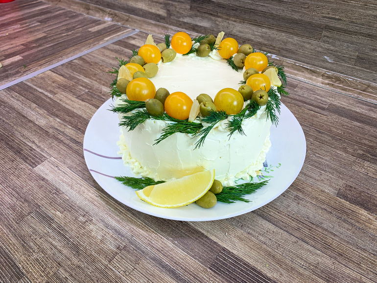 После того как торт отстоялся, снять кольцо и обмазать торт кремом, крем разровнять и можно украшать. Украсить можно по вашему усмотрению. Я оформила веточками укропа, помидорами черри и маслинами. Получилось довольно неплохо)