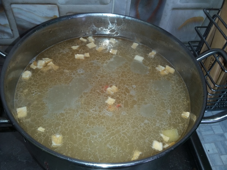 После закипания снять пену, посолить, добавить черный перец, душистый перец, лавровый лист, лук.