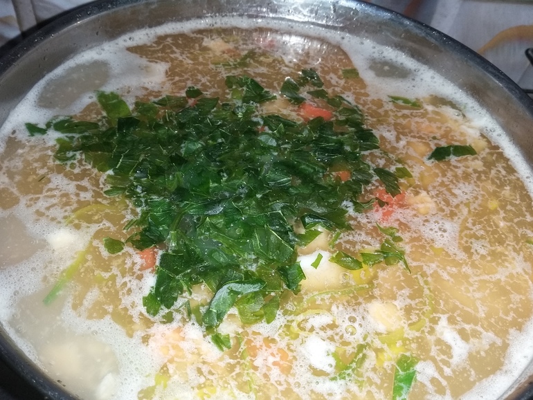 Варить после закипания 5 минут. Всыпать зелень петрушки, закрыть крышкой и снять с огня: