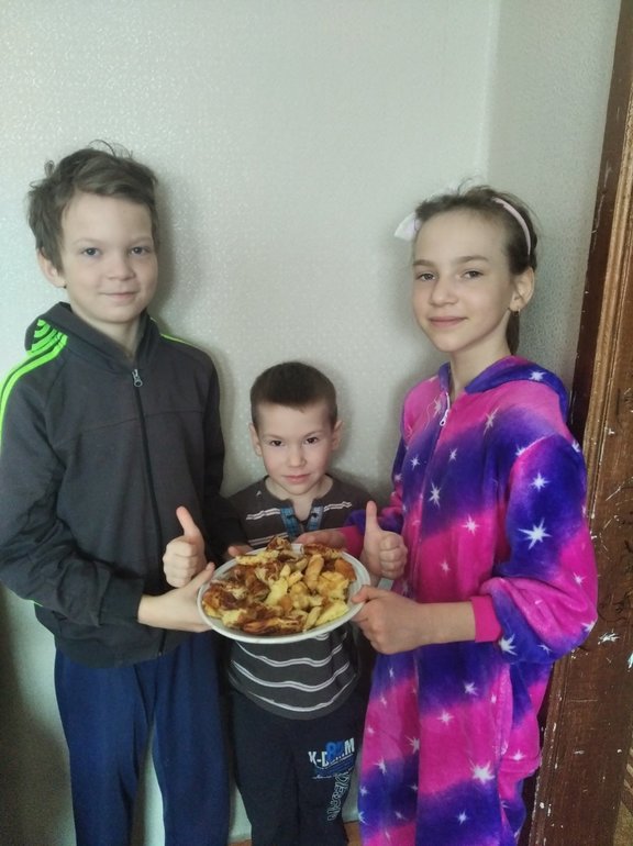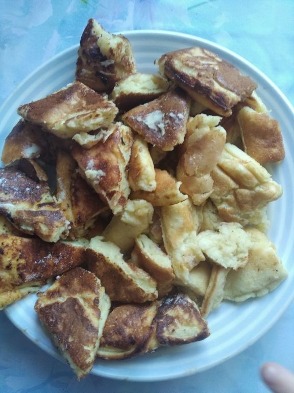 Блинчик понравился всем, Ваня сказал, что он вкуснее вчерашних панкейков, Лиде вчера очень понравилось готовить, поэтому сегодня она была разочарована тем, что сегодня ей почти ничего делать не пришлось и сказала, что панкейки лучше( Мне, наверное, больше понравился кайзершмаррен, он нежнее. Максим тоже ел. На первый взгляд показалось, что получилось очень много, но хватило как раз нам четверым и немного отложили дедушку угостить.