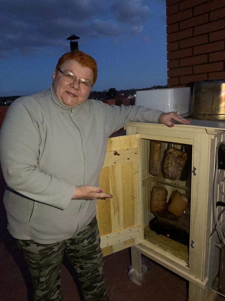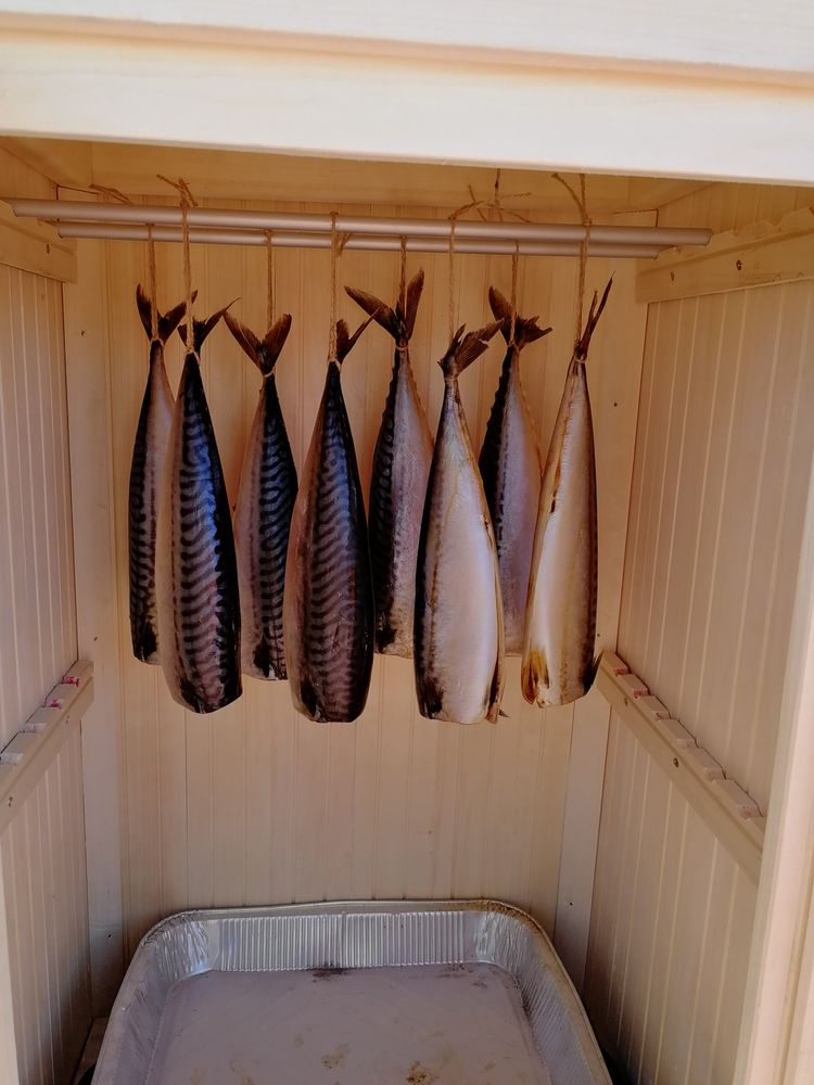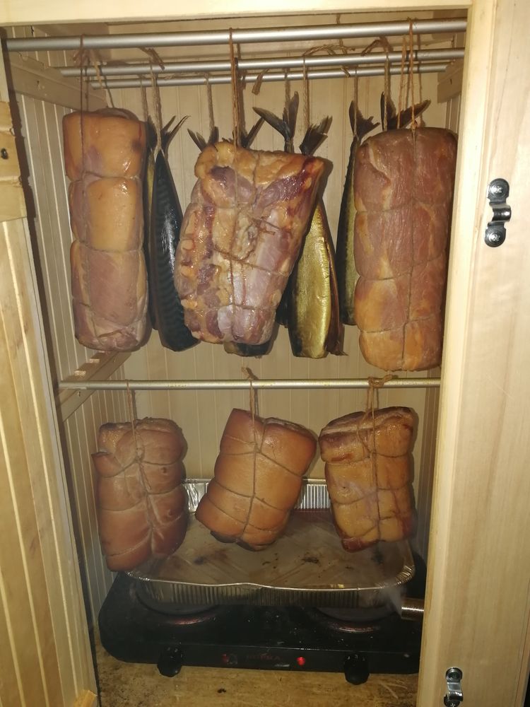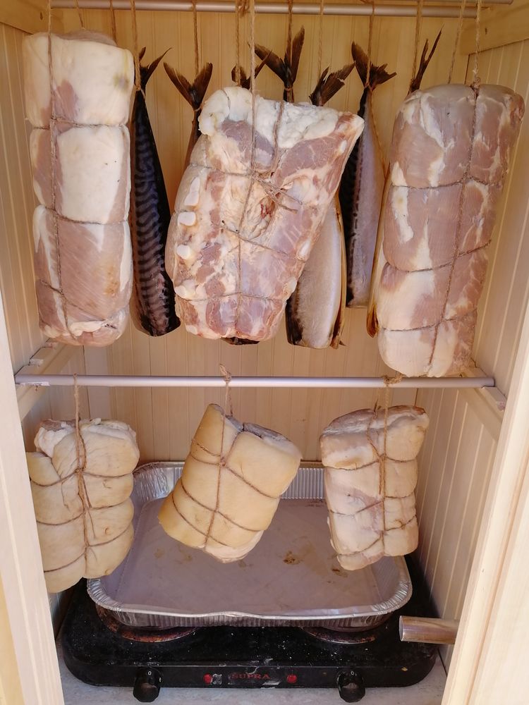 Теперь мясо и рыба просолились и обветрились. Прекрасная блестящая пленочка на них. Пора их отправлять в коптильню.