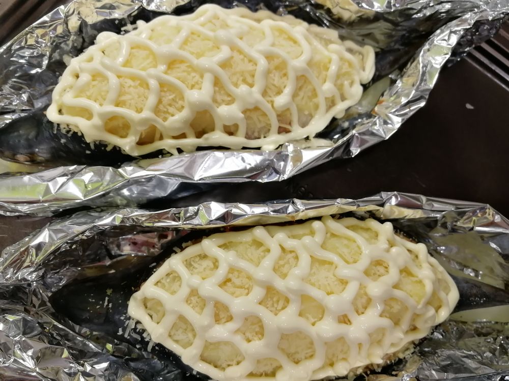 Запекать в прогретой духовке 15 минут при 180 градусах. Достать и нанести чешую майонезным соусом: