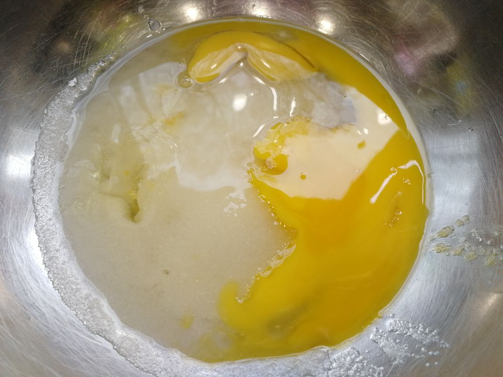 В миску положить 2 яйца, 150 г сахара, щепотку соли, ванилин: