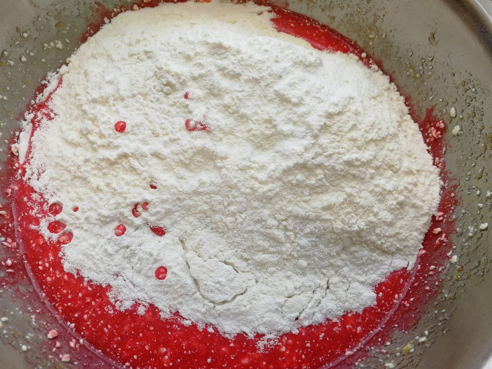 Перемешать. Всыпать 450 г муки, 50 г крахмала, 8 г разрыхлителя: