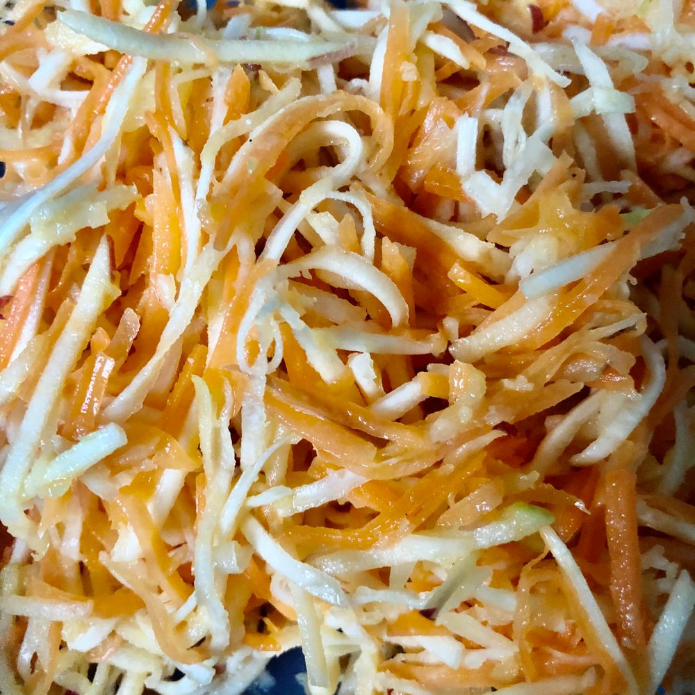 легкий овощной салатик из сельдерея, моркови и яблока, заправка лимонный сок, соль и кунжутный урбеч с оливковым маслом.