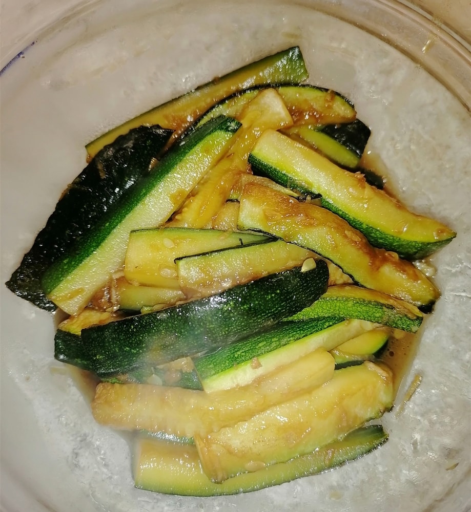 Кабачок нарезать брусочками. Обжарить в масле, до готовности( тут как сами любите, чтоб хрустели или мягкие были). В конце готовки добавляете дольку чеснока тертого, 1 ст.л. соевого сруса и пол чайной ложки меда, можно сахара. Минутку вместе потомили. И готово. Пробуйте на соль, сахар, добавляйте по вкусу.