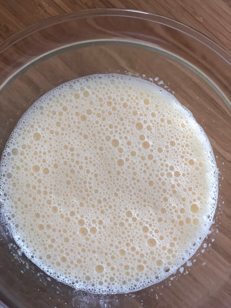 1- Яйца (лучше комнатной температуры) разбиваем в миску, добавляем сахар и взбиваем венчиком до полного растворения сахара и появления светлой пенной шапки.