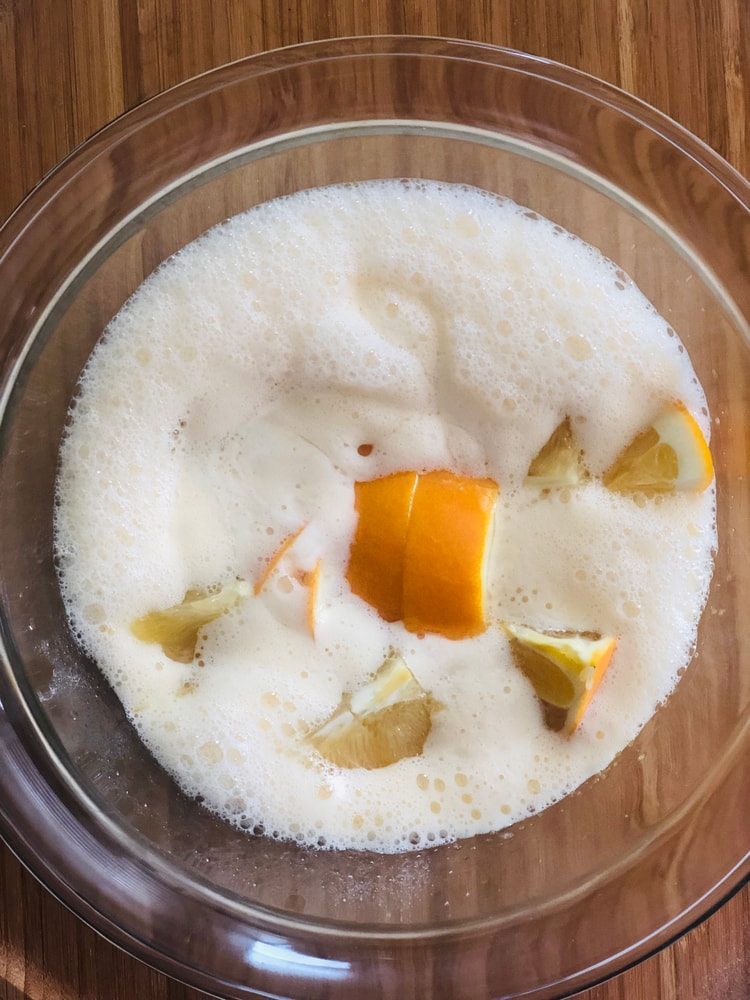2- Один арубсин моем и нарезаем кубиками прямо с кожурой! Именно она дает тот самый незабываемый аромат. Отправляем апельсин в миску к яйцам и хорошенько измельчаем погружным блендером.