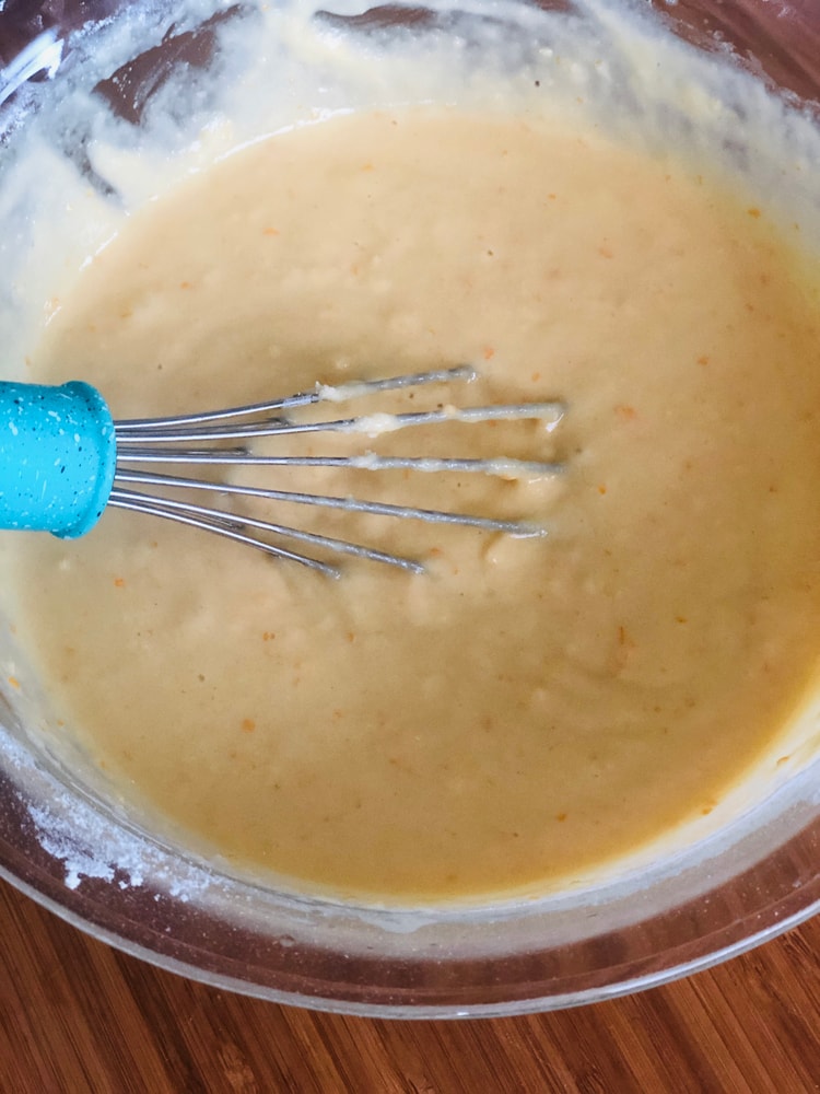 3- Добавляем муку, ванильный сахар, разрыхлитель и растительное масло. Снова всё взбиваем блендером до однородности. У вас получится довольно жидкое тесто с ароматными крупинками апельсина.