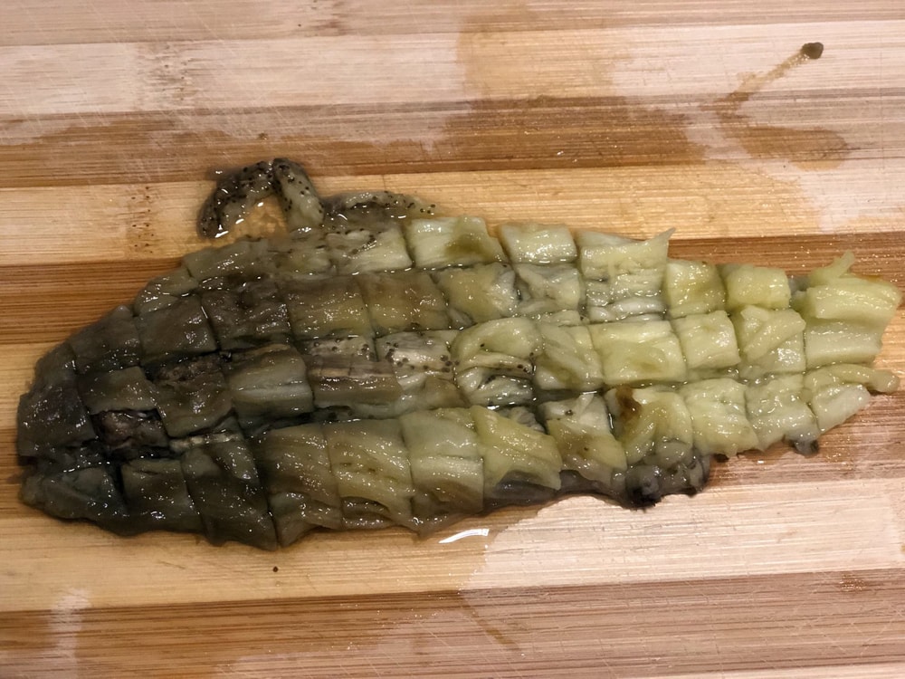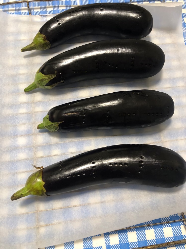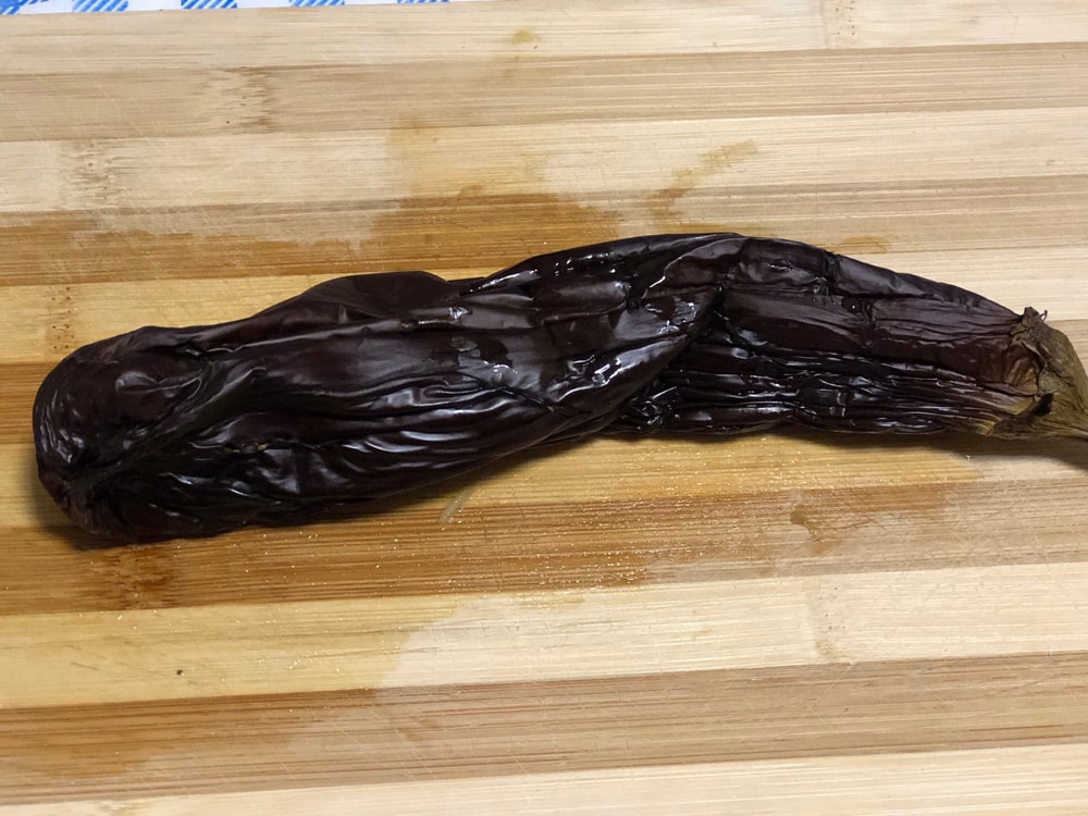 - Баклажаны моем, обсушиваем и в нескольких местах протыкаем вилкой. Это нужно, чтобы они лучше пропеклись и из них выходил пар. Запекаем их в духовке, разогретой до 230 °C с конвекцией, до мягкости и почти черной, обугленной кожицы. Не забывайте переворачивать их каждые 15 минут для равномерного запекания. Обычно на это уходит 35–45 минут.