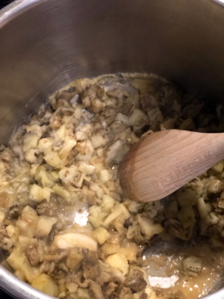 - В кастрюле растапливаем сливочное масло, добавляем муку и обжариваем её, постоянно помешивая. Как только почувствуете ореховый аромат подрумяненной муки, добавляем кубики баклажанов и пропущенный через пресс чеснок. Обжариваем всё вместе ещё пару минут, не переставая помешивать.