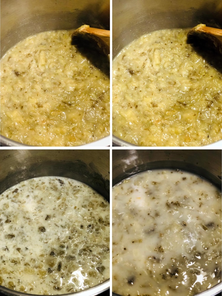 - Теперь тонкой струйкой, постепенно, начинаем вливать воду. Я делаю так: вливаю примерно половину воды, затем всё молоко, хорошо размешиваю и уже потом добавляю оставшуюся воду. Варим на среднем огне до закипания, не забывая помешивать, чтобы ничего не пристало ко дну