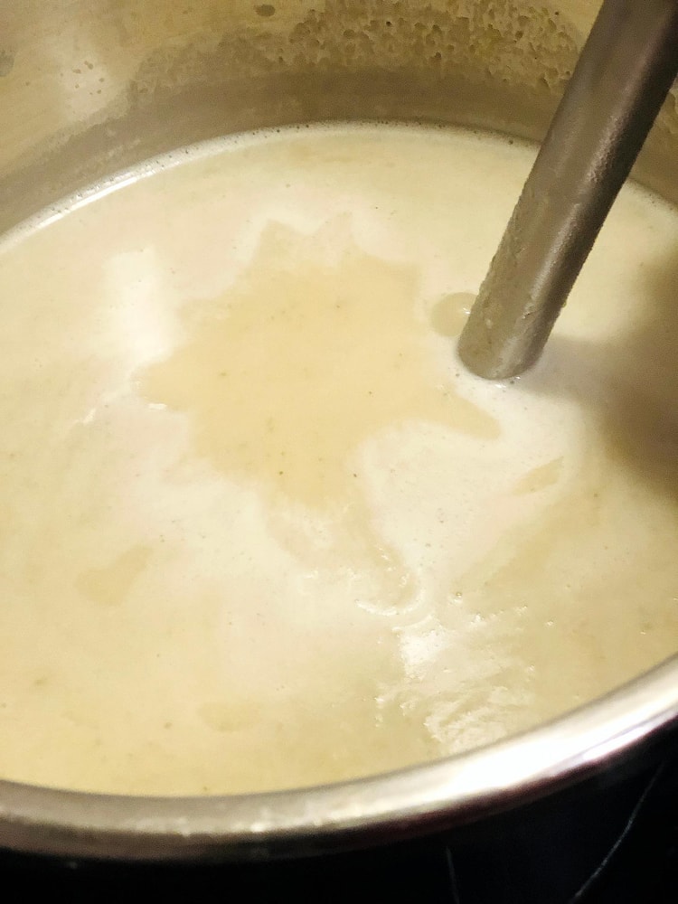 - После закипания убавляем огонь до минимума, солим и перчим по вкусу. Я затем измельчаю суп погружным блендером до однородной кремовой текстуры. И даю ему покипеть на самом маленьком огне ещё минут 10