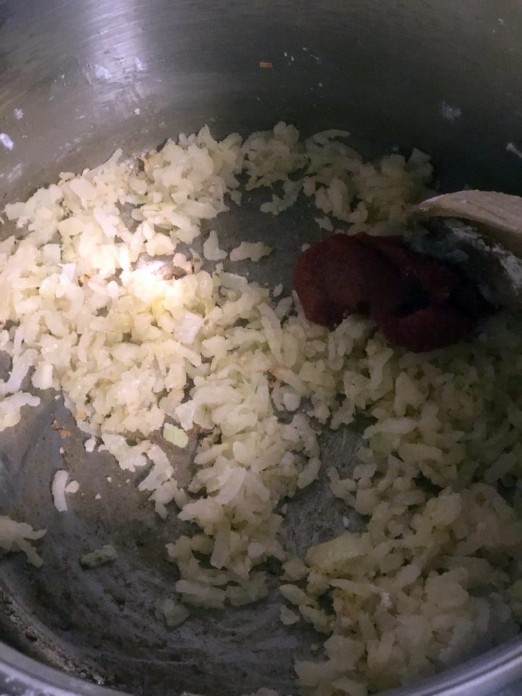 3- Вводим томатную пасту, интенсивно помешиваем еще 30 секунд. Кладем чечевицу, заливаем водой (или бульоном). Накрываем крышкой, доводим до кипения на среднем огне