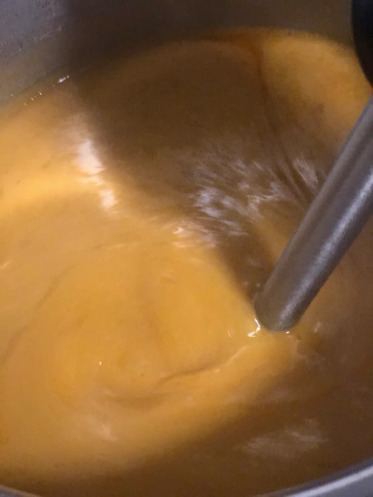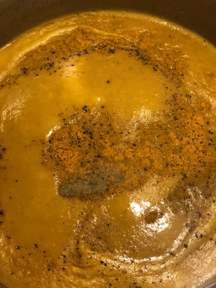 5- Добавляем соль, зиру, перец и куркуму (если используете). Снимаем с огня и измельчаем суп погружным блендером до однородной кремовой консистенции. Возвращаем на огонь и прогреваем еще пару минут