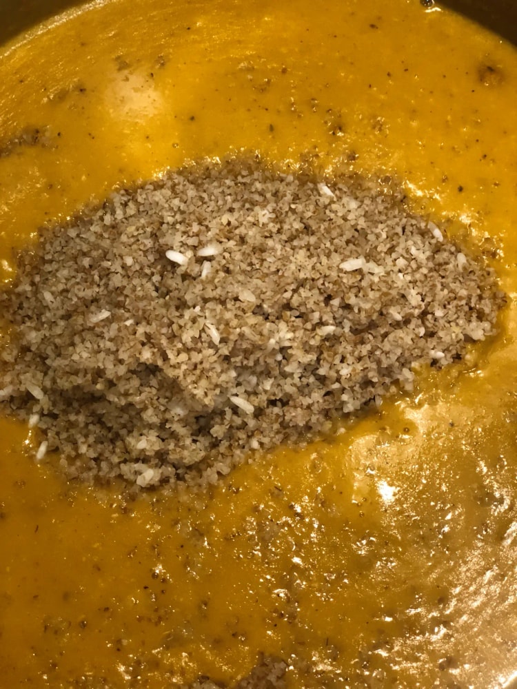 6- Возвращаем суп на огонь. Добавляем булгур и рис, хорошо перемешиваем. Варим около 10 минут на медленном огне, не забывая помешивать, чтобы крупа не пристала ко дну. Рис должен стать мягким.
