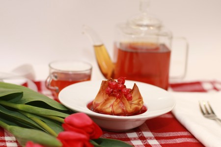 В тарелку налить сироп, выложить фило с начинкой, сверху украсить ягодами.