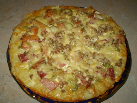 Пиццасделала пиццу, напихала туда всякой всячины: варено-копченой колбасы, мясного хлеба, соленых огурчиков, лисичек, майонеза, немного китайского салата, сыра, люблю почему-то еще со шпротами, но их к сожалению не было...тесто, сорри, покупное...через 10 минут после приготовления осталось уже только половина пиццы;)