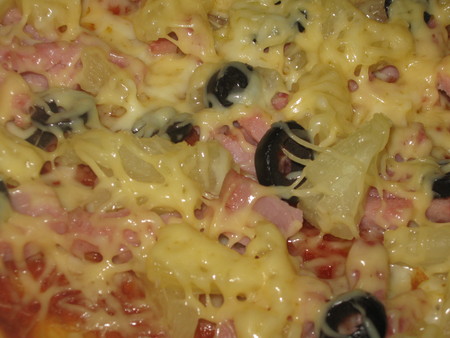 Вот так! Рецепт простой очень. Каюсь сразу, тесто было готовое, дрожжевое для пирожков и пиццы. Раскатать тесто по ... любой поверхности на которой вы пиццу печь собираетесь. Смазать тесто томатной пастой, поставить в духовку минут на 10-15. Достаем, посыпаем сыром, и выкладываем начинку, в данном случае это нарезаная мелко ветчина, нарезаные кусочки консервированого ананаса, и кружочки маслин. Ставим в духовку минут на 10 максимум. ( начинка не должна начать " гореть") Вытаскиваем, посыпаем от души тертым сыром, и до расплавления сыра в духовку. Усе! Мы сметаем такую за секунды)))