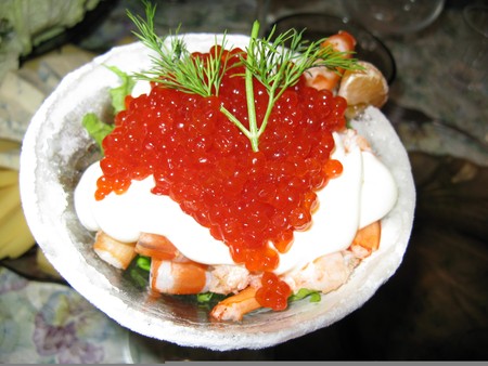 Все кладем в бокал слоями: салат, креветки, мандарины, майонез, сверху полить чуть-чуть лимонным соком и выложить икру, чем больше, тем лучше! Украсить долькой мандарина и креветкой, можно укропчиком. перед употреблением перемешать. Бокал можно украсить обмакнув в белок потом в сахарную пудру.