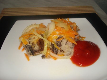 Я брала рыбу "Хек". Порезать кусочками. Обвалять в муке и немного поджарить на сковородке. Все обжаренные кусочки сложить в кастрюльку залить (майонезом разведенным в стакане воды). Поставить на огонь. Как закипело сверху положить резанный кольцами лук и тертую на терке морковку, а также соль по вкусу и перчик черный. Все тушить на медленном огне до готовности.