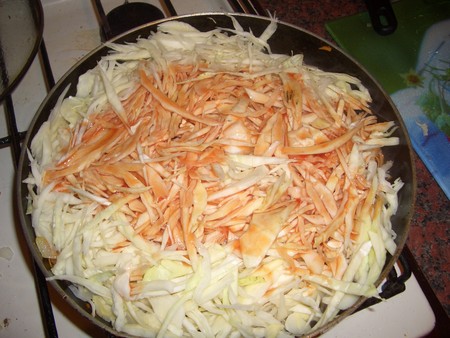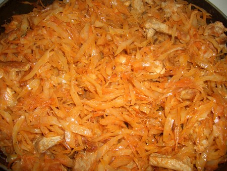 Затем добавить мясо,посолить поперчить,перемешать и тушить еще 5-7 минут (тут уже кто как любит,если любите хрустящую капусту,то и 3-х минут достаточно,если мягцю то дольше!)