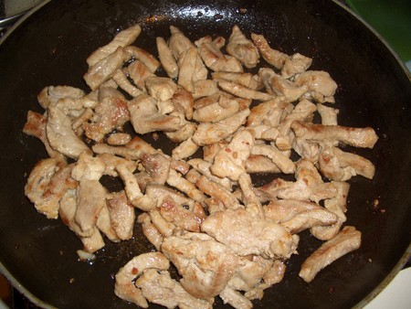 мясо нарезать брусочками и обжарить на раст.масле до готовности