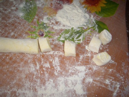 разделитт тесто на части из которых скатать колбаски, порезать на небольшие кусочки примерно 2см шириной
