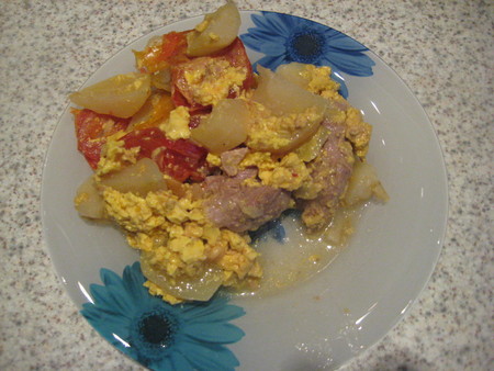 телятинка в овощно-омлетном соусе. На дно выкладываем филе молодого теленка ,солим перчим,нарезаем лук кольцами,след слой картофель,солим,перчим,потом опять лук и сверху помидоры.