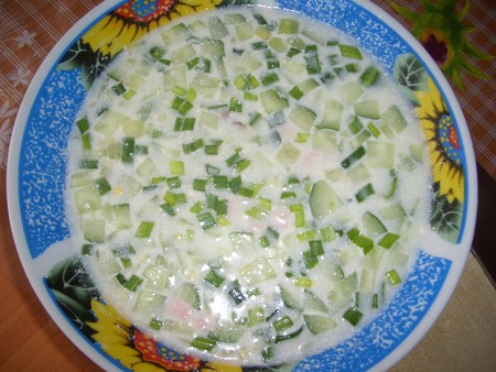 Заливаем холодной сыроваткой и холодной минеральной водой. Добавляем майонез, горчицу и сметану, перемешиваем и пробуем! Далее по вкусу солим и добавляем лимонной кислоты! Ставим в холодильник!