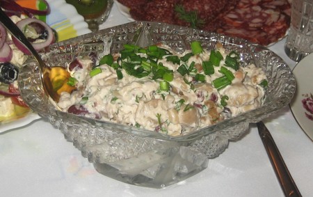 Грудку обжариваем, режем, добавляем промытую фасоль, обжаренные с луком грибы, зелень, засыпаем сухари и заправляем все это майонезом.
