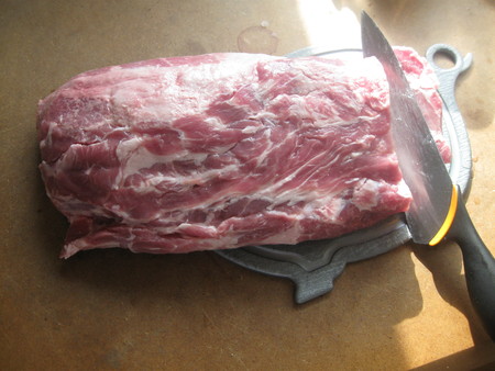 Берём свинину, лучше всего подойдёт для этого шея. На олбычный противень понадобится около 1200-1500 мяса