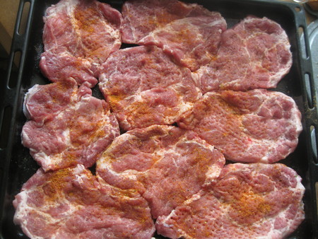 Каждый кусочек с двух сторон посыпаем всякими специями и солим с одной стороны. противень смазываем растительным маслицем и выкладываем мясо