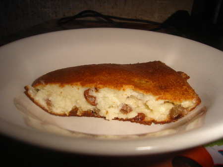 Творог растереть с желтками, сахаром, простоквашей + сода, маслом, солью, туда же муку и крахмал. Белки взбить отдельно и ввести в творог. Добавить изюм, вылить в сковороду (предварительно смазанную маслом и посыпанную сухарями). Выпекать около часа!