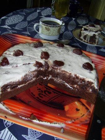 Готовый тортик можно разрезать на две части, пропитать сиропом (я смешивала клубничное варенье с водой), а затем промазать кремом (сметану взбиваем с вареньем или с сахаром).