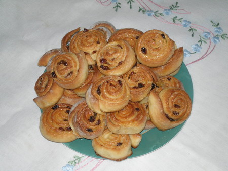 Каждый шар раскатываем и полученный пласт смазываем начинкой (кстати, ее хватит на 3 шара теста), скрутить в рулон и нарезать на кусочки. Лист присыпать немного мукой и расставить кусочи, пусть постоит минут 10. Духовку разогреть, где-то до 180 гр и ставить! По виду смотреть как испекутся! Пекутся очень бустро!