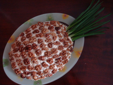 Я тоже "Ананас" недавно делала, но вместо орехов ложила маринованные шампиньоны, т.к. я их очень люблю:)
